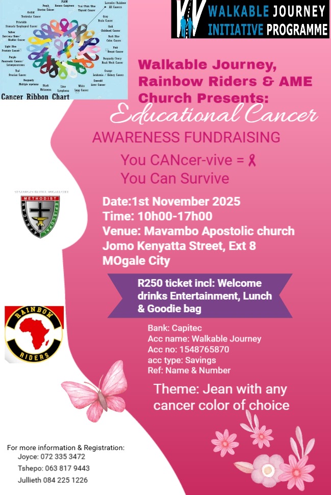 The WALKABLE JOURNEY INITIATIVE PROGRAMME’s main objectives are to: (i) Create awareness about all forms of Cancer and provide pre and post counselling. (ii) Provide health, spiritual and moral support to the affected individuals and their families. (iii) Promote and encourage healthy life-style amongst the affected people through appropriate training. (iv) Establish and develop care centres that will assist to provide physical and psychological care for the affected individuals. (v) Establish care support groups in the affected surrounding communities, rural and informal settlements. (vi) Work closely and in conjunction with similar organisations and government departments that seek to reach out on communities on issues related to the aforesaid objectives.